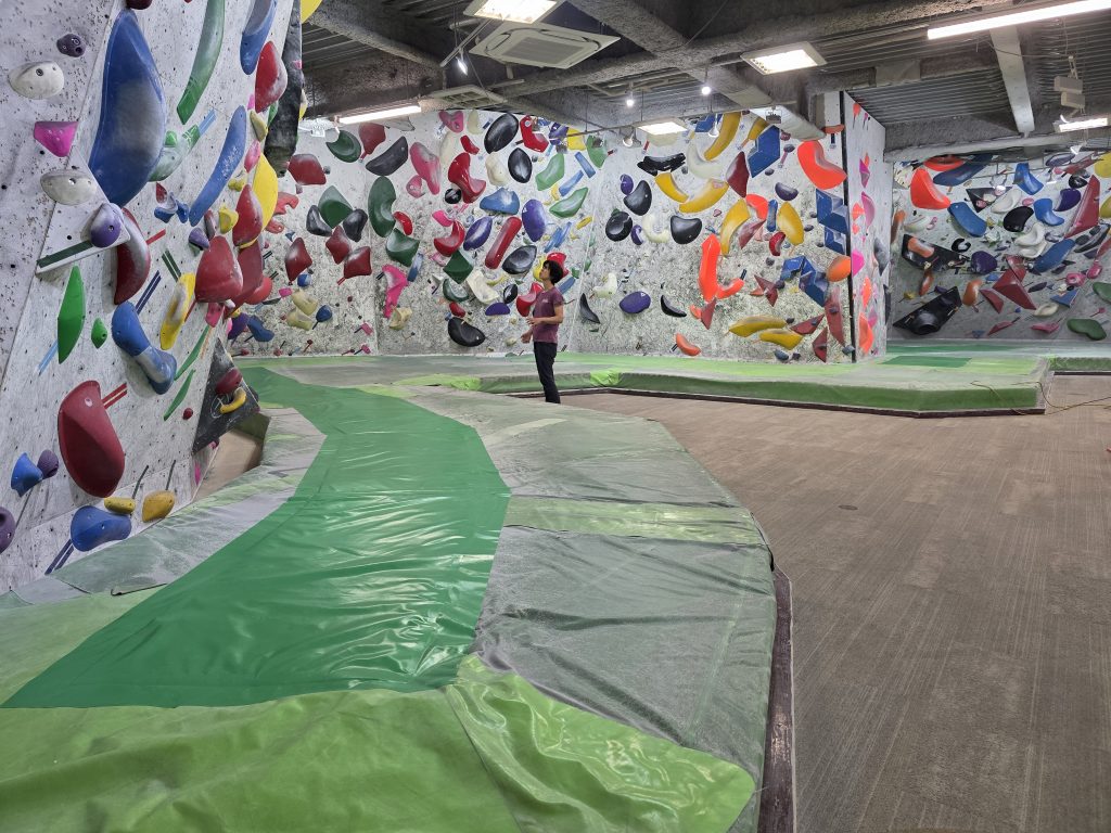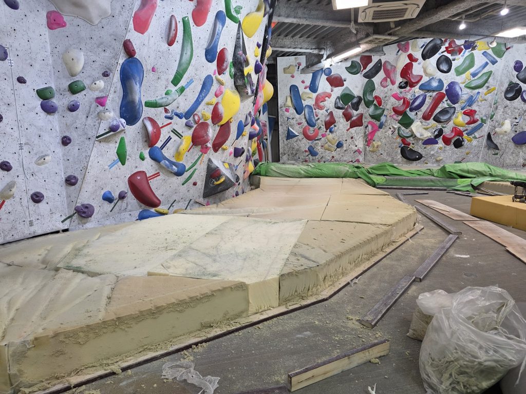 4階屋外ボルダーに続いて、2階の左エリアのマットのメンテナンスを行いました。
